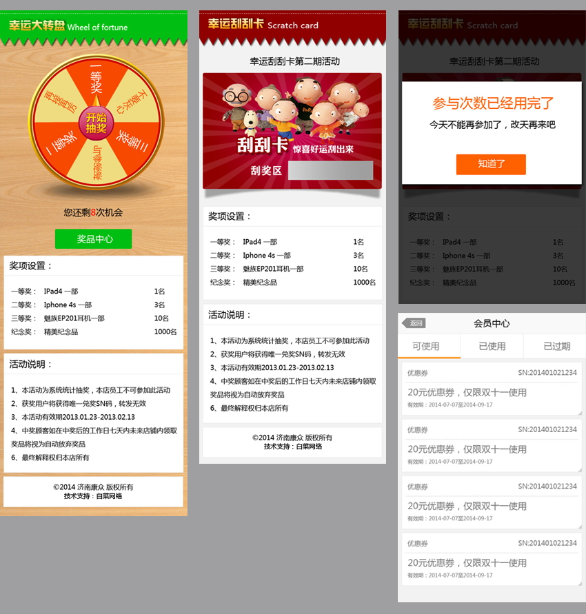 采用html5技術(shù),實(shí)現(xiàn)大轉(zhuǎn)盤和刮刮卡功能,后臺(tái)可設(shè)置活動(dòng)獎(jiǎng)品、中獎(jiǎng)率、參與次數(shù)以及對(duì)活動(dòng)內(nèi)容進(jìn)行跟蹤管理