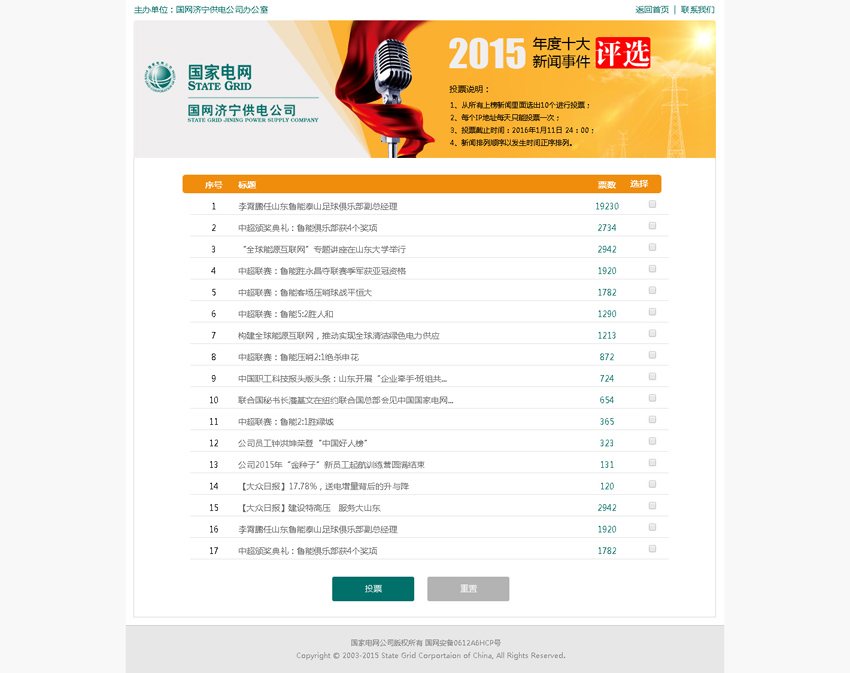 國網(wǎng)濟(jì)寧供電公司年度十大新聞事件評(píng)選活動(dòng)。是白菜網(wǎng)絡(luò)為客戶定制的小型投票管理系統(tǒng),系統(tǒng)采用PHP語言開發(fā),獨(dú)立管理后臺(tái),可實(shí)時(shí)查看投票,自動(dòng)更新排序。