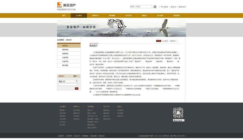 山東黃金集團(tuán)是山東省省屬國有大型骨干企業(yè),2013年在中國企業(yè)500強(qiáng)中排名197名,在黃金及貴金屬冶煉領(lǐng)域排名全國第一。山東黃金地產(chǎn)旅游集團(tuán)有限公司是山東黃金集團(tuán)的全資子公司,成立于2006年,注冊(cè)資金3億元,擁有房地產(chǎn)一級(jí)開發(fā)資質(zhì),是省國資委確定的黃金集團(tuán)“礦業(yè)+地產(chǎn)”兩大主業(yè)之一,主要負(fù)責(zé)管理山東黃金集團(tuán)的房地產(chǎn)開發(fā)經(jīng)營和旅游地產(chǎn)運(yùn)營,擁有集地產(chǎn)、旅游、餐飲、高爾夫、汽車、裝飾、物業(yè)于一體的特色資源產(chǎn)業(yè)鏈,形成了“黃金地產(chǎn)”、“黃金旅游”、“黃金裝飾”、“黃金物業(yè)”、“黃金汽車”等金字品牌。