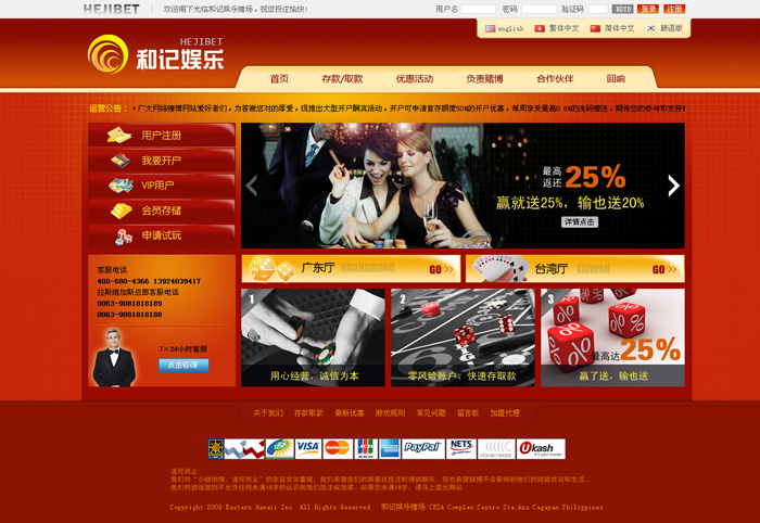 最具港澳特色的游戲網(wǎng)站和記娛樂是由香港金融投資集團(tuán)投入數(shù)億巨資打造。為體現(xiàn)其港澳特色,故用“和記”命名。和記股東資金實(shí)力雄厚、現(xiàn)金充裕。在貨柜碼頭、零售連鎖集團(tuán)、地產(chǎn)發(fā)展與電訊及電臺(tái)廣播等多元化業(yè)務(wù)領(lǐng)域均有涉獵。其中和記娛樂主要負(fù)責(zé)開拓游戲網(wǎng)站業(yè)務(wù)。