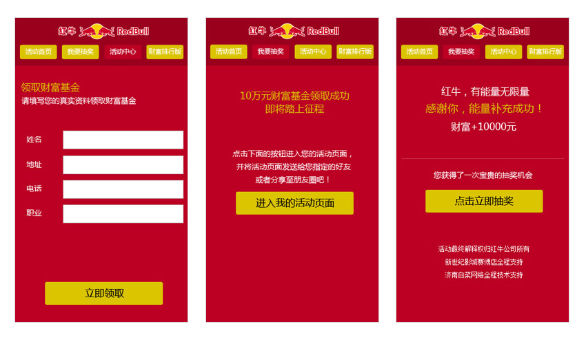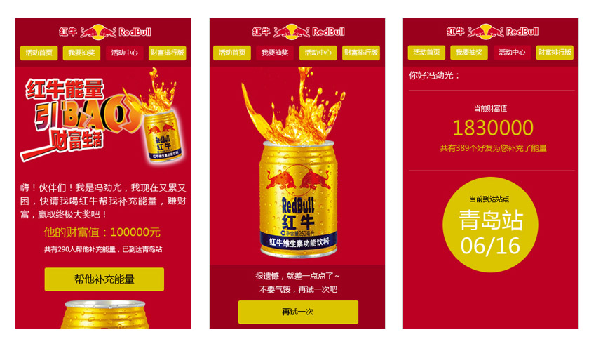 2013年,我們?yōu)榧t牛量身定制了一套微信活動(dòng)?;顒?dòng)采用html制作。用戶通過(guò)關(guān)注紅牛官方微信,并領(lǐng)取活動(dòng)財(cái)富,轉(zhuǎn)發(fā)朋友圈,并積攢財(cái)富,疊加抽獎(jiǎng)的形式進(jìn)行,活動(dòng)期間參與人數(shù)達(dá)到2萬(wàn)人次,有效的進(jìn)行了品牌推廣和增加粉絲關(guān)注。