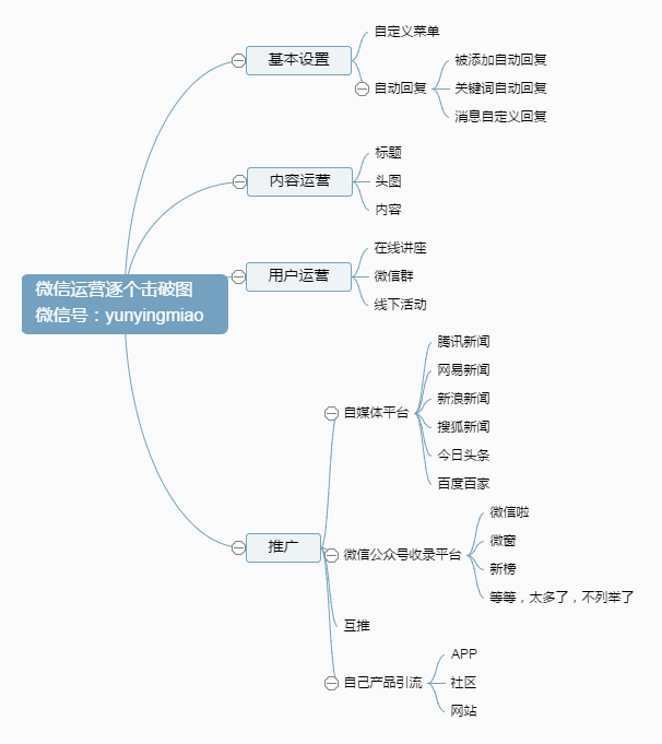 下圖是運營喵制作的一個微信運營逐個擊破圖: