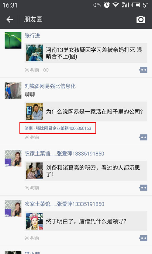 很多人都知道朋友圈轉(zhuǎn)發(fā)是一個做廣告的最好方式,但在做廣告之前。你如何把你的產(chǎn)品植入你的朋友圈里。不是一個轉(zhuǎn)發(fā)就能解決問題的。除了朋友圈。你還可以利用你的位置簽名、二維碼名片等微信其他功能。告訴你所有的朋友你是干什麼的。有時候一個位置簽名的效果甚至?xí)饶闾焯燹D(zhuǎn)發(fā)朋友圈的廣告還有效。見下圖,就是我一位做網(wǎng)易郵箱的朋友,發(fā)布的朋友圈內(nèi)容。這樣可比直接廣告刷屏更能體現(xiàn)你的存在感和廣告效果。