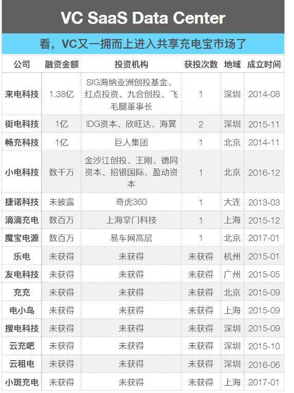 還是《金融界》的報道標(biāo)題總結(jié)得好:《10天融資近3億,IDG、騰訊、朱嘯虎、王剛等20家機(jī)構(gòu)入局,共享充電寶火了》,到底火不火我說了不算,具體看VC-SAAS這張表吧: